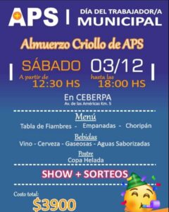 Novedades AVISO IMPORTANTE lunes, 17 de octubre de 2022 APS Estimad@s afiliad@s recuerden que hasta el día 20/10 se pueden adquirir las tarjetas del ALMUERZO CRIOLLO para ser abonadas en dos cuotas.- Nuestra tradicional fiesta será el Sábado 3 de diciembre en CEBERPA a las 12.30 hs. Los esperamos!! ¡Compartí este artículo con tus contactos!