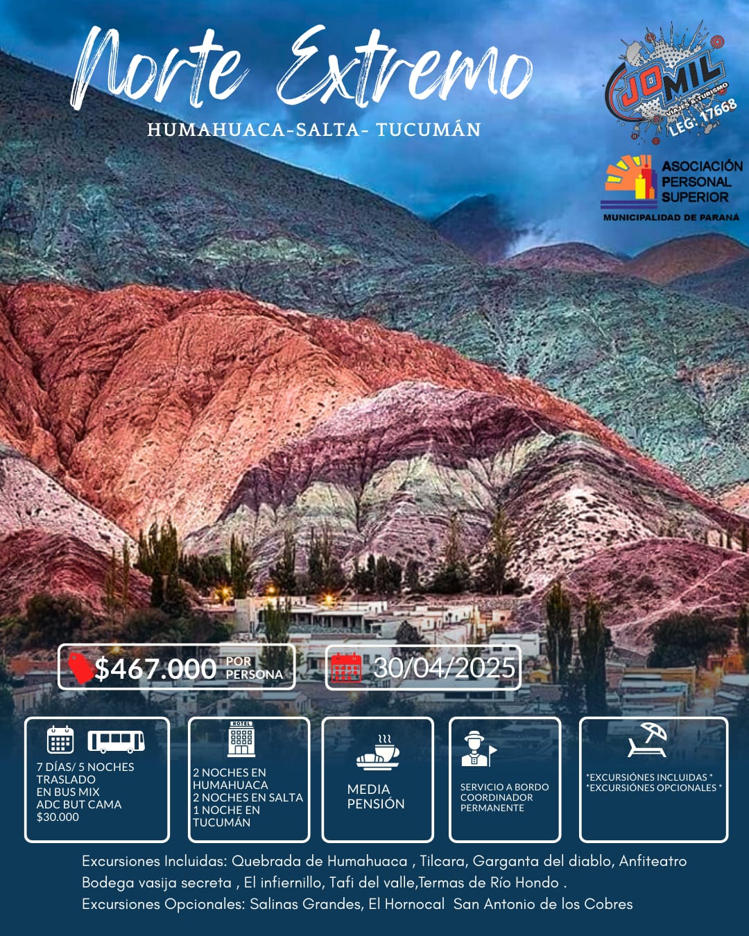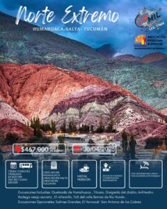 Destacado Novedades NOS VAMOS AL NORTE!! jueves, 27 de febrero de 2025jueves, 27 de febrero de 2025 APS Querid@s compañer@s ya tenemos nuestro primer destino viajero 2025 y es al Norte un NORTE COMPLETISIMO!!! Serán 7 dias/5noches, saliendo el día miércoles 30/04 por la tarde y recuerden que el día 1° y 2 de mayo NO SE TRABAJA!! El viaje incluye 2 noches de alojamiento en Humahuaca, 2 noches en Salta y una noche en Tucumán.- Servicio de Media pensión.- Excursiones incluidas: Quebrada de Humahuaca (Purmamarca, Tilcara, Maimará, Humahuaca), Quebrada de las Conchas, Garganta del Diablo y Anfiteatro, Bodega Vasija secreta, El Infiernillo, Tafí del Valle, La Yunga tucumana, Termas de Rio Hondo.- Opcionales: Salinas Grandes , El Hornocal, San Antonio de los Cobres.- Hasta el 15/03 podes reservar haciendo una entrega y el resto en cuatro cuotas.- Cualquier duda que tengas comunicate con nuestra Secretaria de Turismo Carolina (343-4697145) o acercate al gremio que te contamos mas detalles de este hermoso destino.- ¡Compartí este artículo con tus contactos!