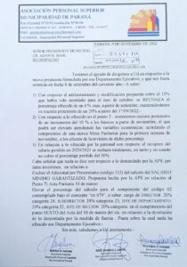 Destacado Novedades PARITARIAS SEPTIEMBRE 2022 viernes, 9 de septiembre de 2022miércoles, 28 de septiembre de 2022 APS En el día de ayer el Ejecutivo Municipal envió por escrito la nueva propuesta oficial, consistente en: Adelantamiento del aumento previsto para el mes de octubre al mes de septiembre, incrementando además el porcentaje del 11% al 15% Mantener abierta la discusión salarial acordando fecha de nueva convocatoria en noviembre Recuperación integral del salario municipal del 2% mensual para marzo, abril, mayo, agosto, septiembre y octubre 2023 con base al salario de setiembre de 2022 Ante ello, la APS ha dado respuesta bajo Expte N°22575/2022 de fecha 09/09/2022 , siendo ésta la siguiente: 1) Con respecto al adelantamiento y modificación propuesta sobre el 11% que había sido acordado para el mes de octubre: se RECHAZA el porcentaje ofrecido de un 4 % mas, a par… 2) Con respecto a lo ofrecido en el punto 2 : sostenemos nuestra pretensión de un incremento del 10 % a los básicos a partir de noviembre, el que podrá ser elevado atendiendo las variables económicas; acordando el compromiso de una nueva Mesa Paritarias para la primera semana de noviembre, a los efectos de la revisión de dicho porcentaje 3) En relación a lo ofrecido por la patronal con respecto al recupero del salario perdido en 2020/2021 se RECHAZA totalmente, en tanto y en cuanto no cubre el porcentaje perdido del 30% Cabe señalar que nada se dice con respecto a lo demandado por la APS; por lo tanto insistimos, en relación a: Excluir el Adicional por Presentismo (código 312) del cálculo del SALARIO MINIMO GARANTIZADO, Propuesta hecha por la APS en relación al Punto 7) Acta Paritaria 10 de marzo Elevar el porcentaje del cálculo para el componente del código 02 contemplado bajo el concepto “ex 679”, a saber: cargo de DIRECTOR: 20% categoría 24; SUBDIRECTOR 20% categoría 23, JEFE DE DEPARTAMENTO: 20% categoría 22, JEFE DE SECCIÓN 20% categoría en el cumplimiento del punto SEXTO del Acta del 10 de marzo del cte. en relación a la devolución de lo descontado por la medida de fuerza . Pauta sobre la cual nada ofreció el Departamento Ejecutivo.- ¡Compartí este artículo con tus contactos!