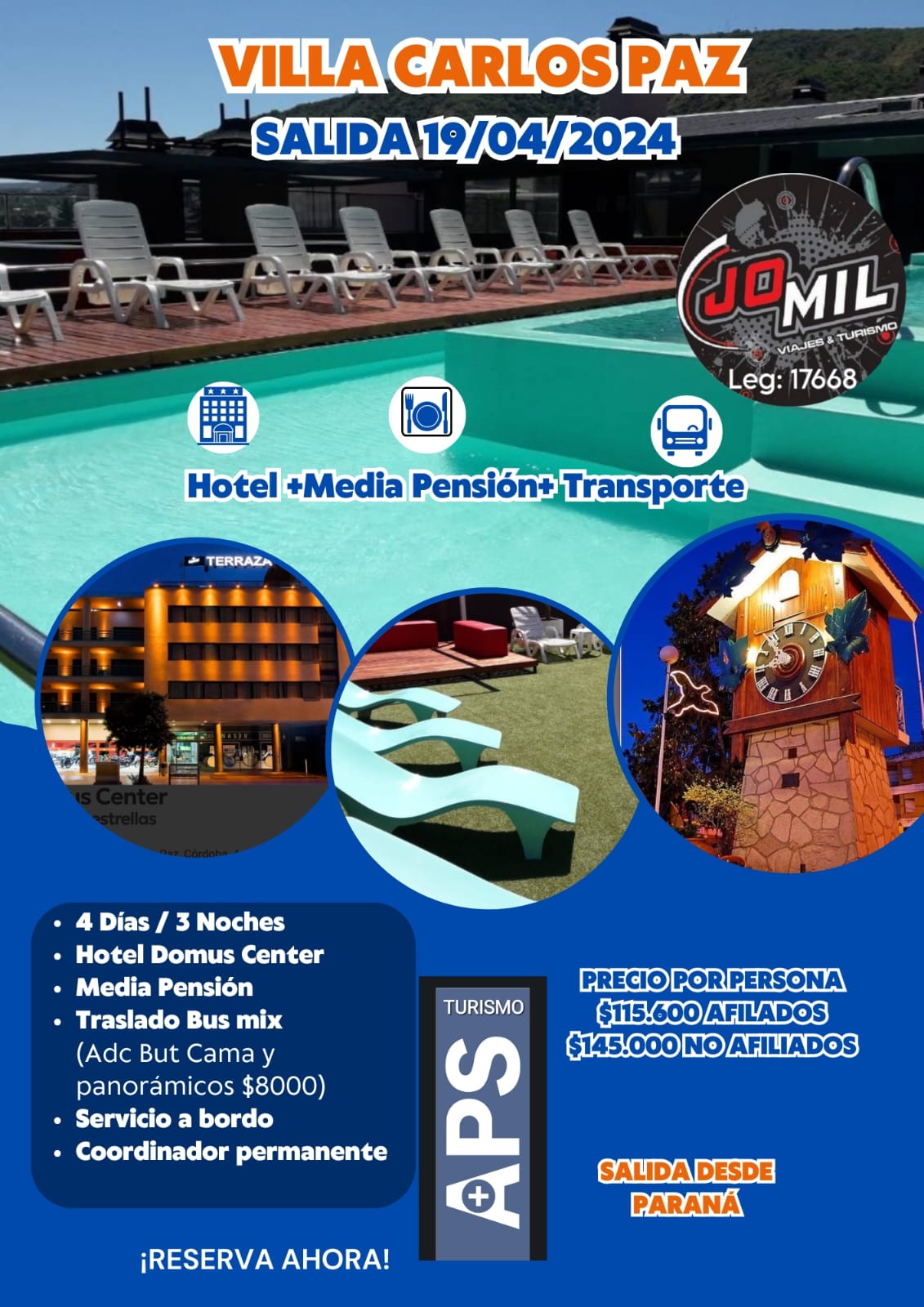 Salimos el viernes 19 de abril para disfrutar de 4 días-tres noches en la hermosa Carlos Paz, con servicio de media pensión en el hermoso Hotel DOMUS CENTER ubicado en pleno centro.-
