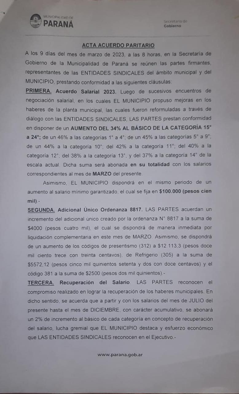 La Asociación Personal Superior de la Municipalidad de Paraná (APS) informa que en la mañana de este jueves recibió una propuesta salarial desde el Departamento Ejecutivo Municipal.