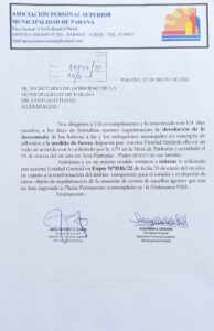 Asimismo y bajo Expte.N° 11141/22, hemos formalizado los requerimientos que le trasladamos días pasados al Secretario de Gobierno, respecto de efectivizar la devolución de lo descontado por la adhesión al PARO decretado por la y que fue acordado también en la última Mesa Paritaria; como así tambien le reiteramos lo solicitado por nuestra Entidad Gremial en Expte N°1516/22 de fecha 31 de enero del cte.año, en cuanto a la conformación del ámbito contemplado en la Ordenanza 9183, para revisar y regularizar los casos de trabajadores y trabajadoras que están pendientes de su pase a planta permanente/contrato de servicios.-
